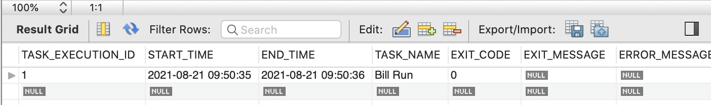 spring batch 아무 메타테이블에나 접속해보면 마찬가지로 실행 정보가 잘 들어가 있다. 아래 테이블은 task_execution 이다.
