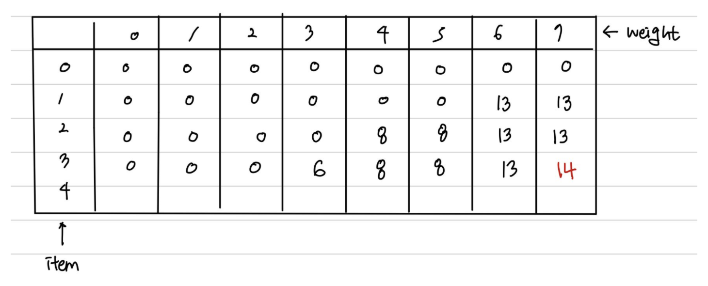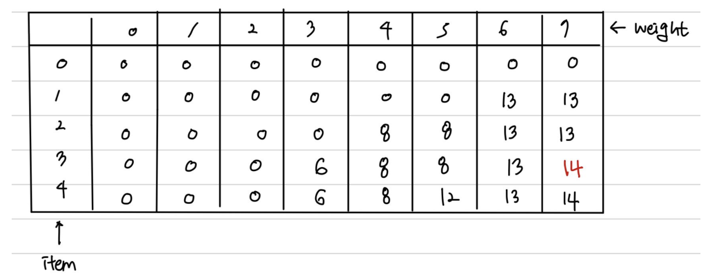 아이템 1~4개 있고, 최대 무게 7일 때 최대 가치였다. 즉, dp 가장 마지막 데이터 dp[4][7]=14를 출력하면 문제의 정답이다.