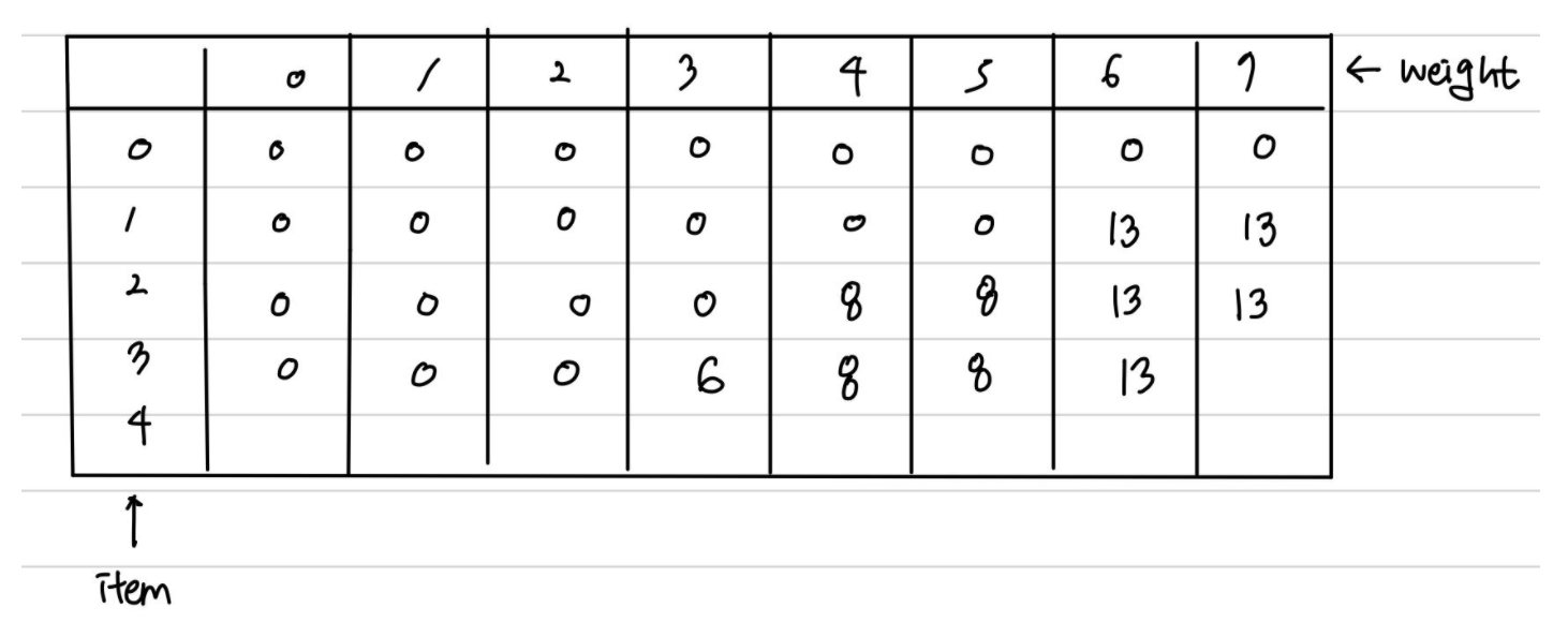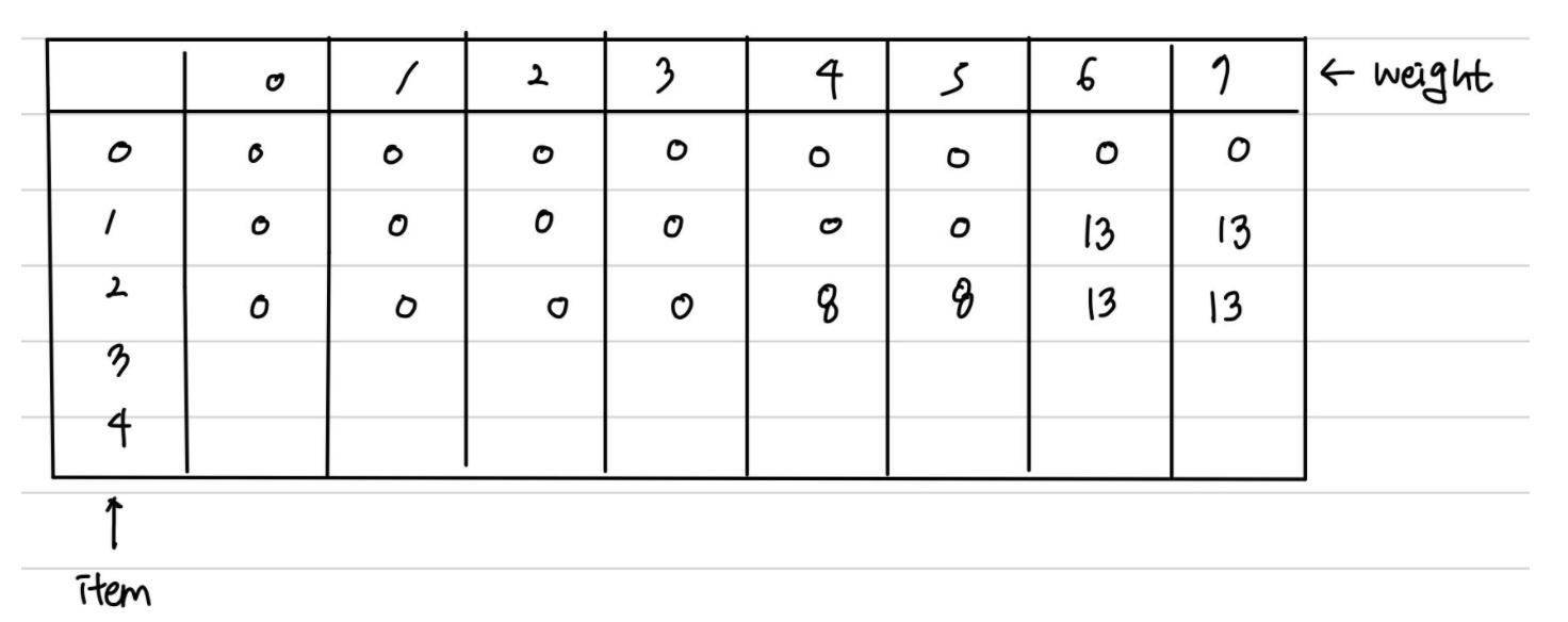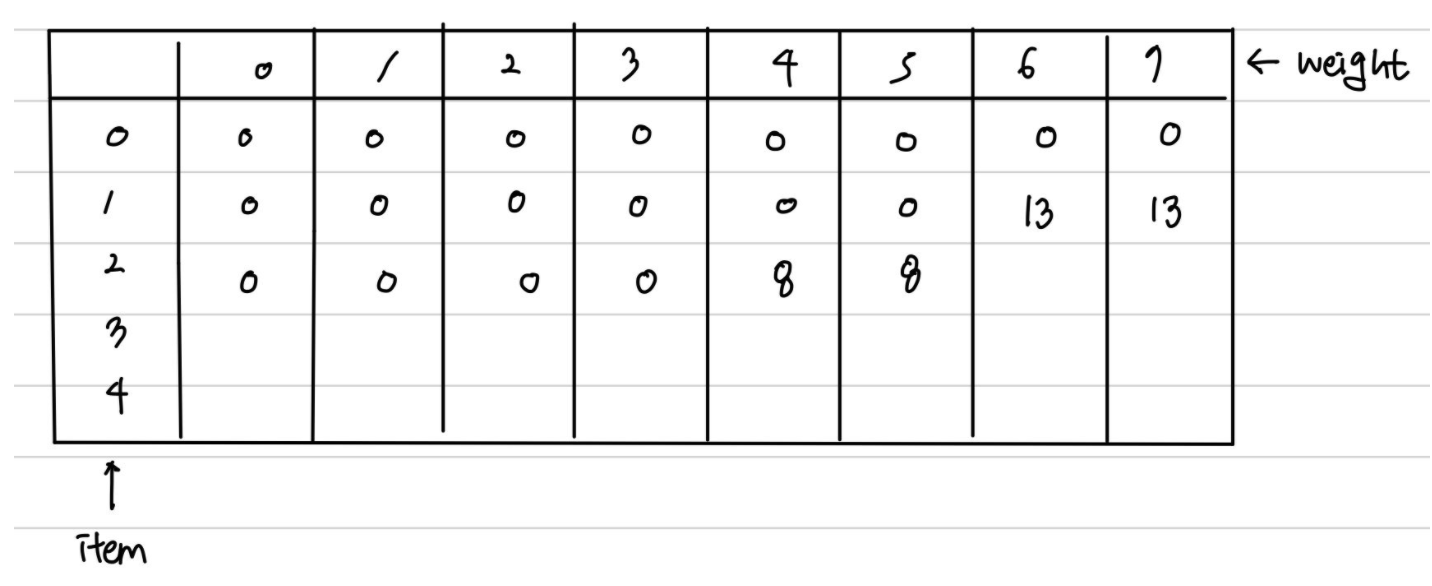 결과적으로 아이템 2를 포함했을 때 최대 가치는 8(아이템 2의 가치) + dp[1][0] = 8 이다.