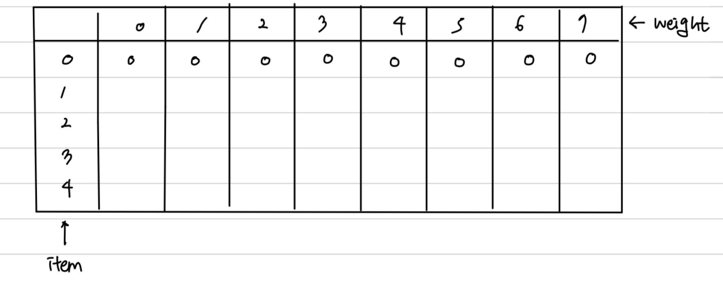 2. 먼져, 아이템이 0개 일때는 채울 수 있는 무게가 하나도 없으므로 배열에 모두 0이 들어간다.