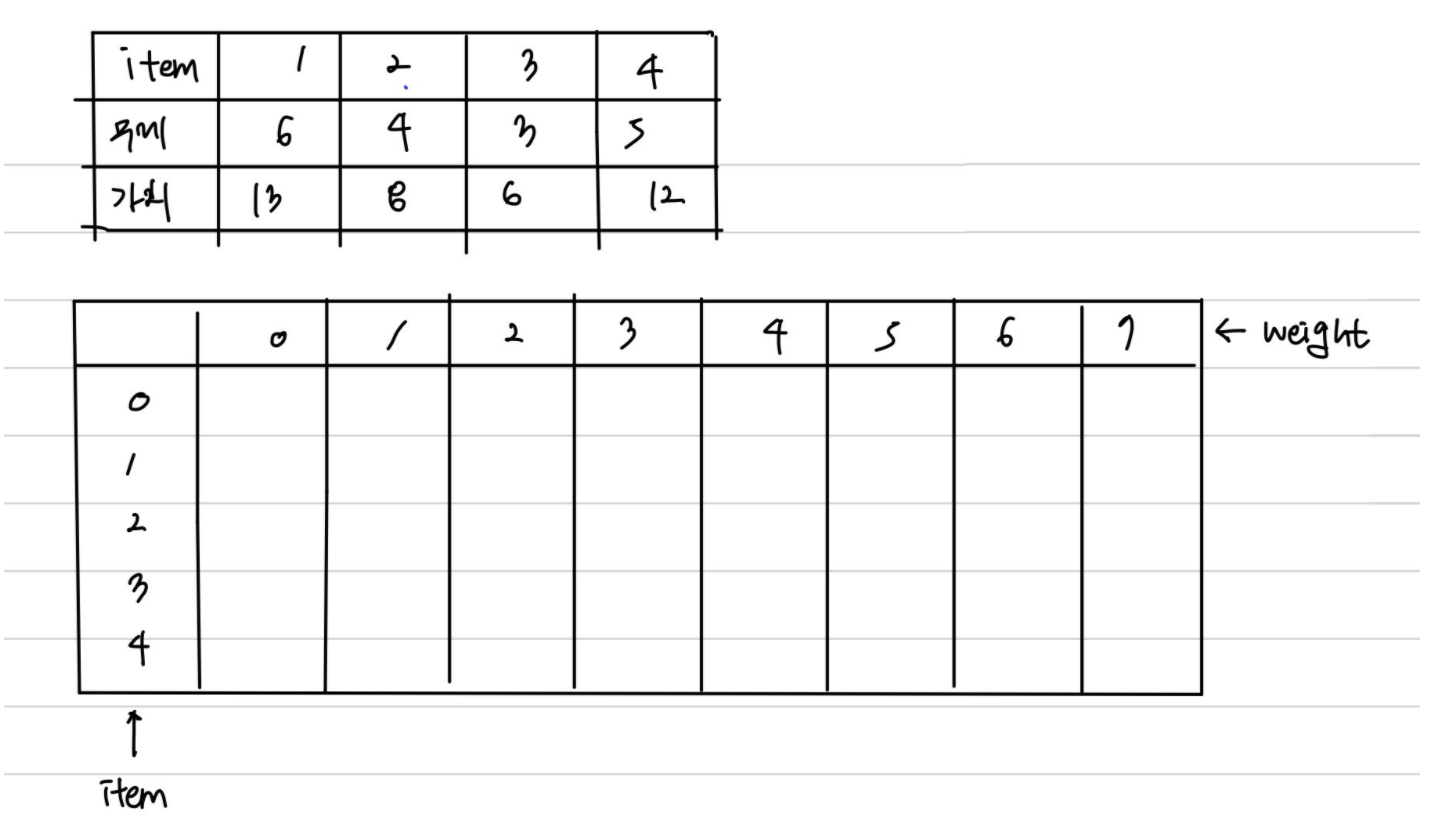 그럼 이제 남은 무게 4를 아이템 1~2로 채워야겠지. 그러면 dp[2][4] 를 구해야겠지.
