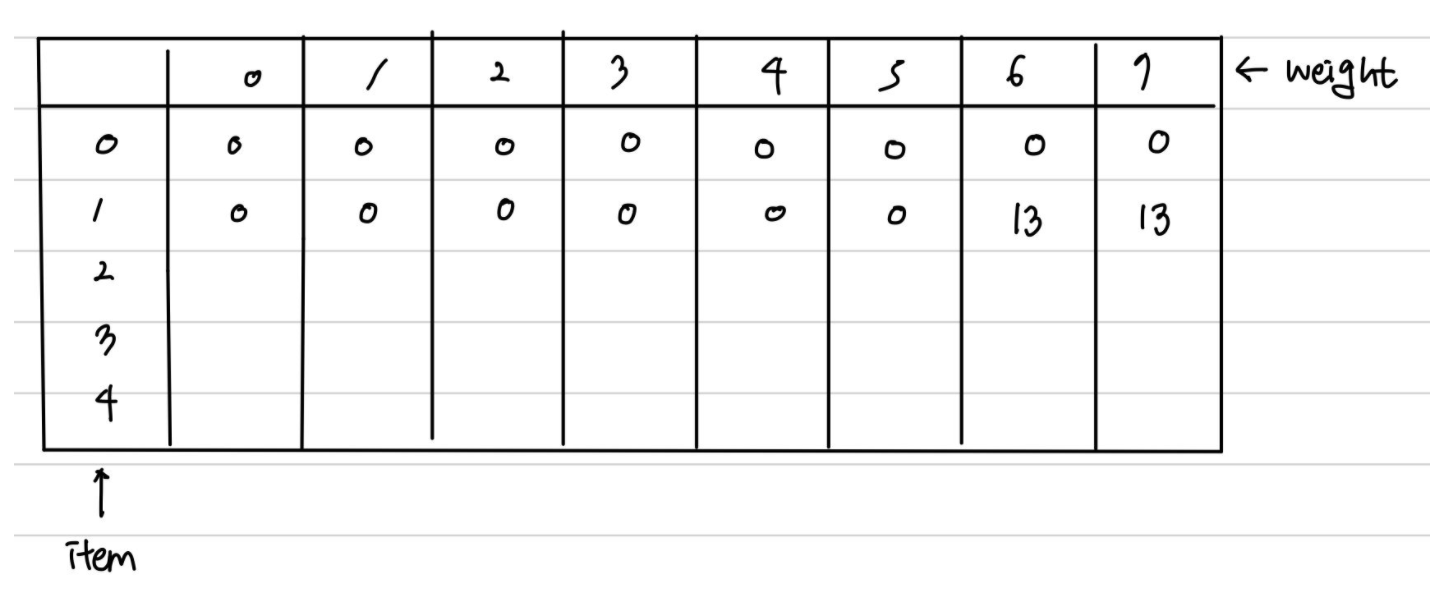 1번 경우 아이템 3을 포함하지 않는 경우는 dp[2][7] = 13일 것이다.