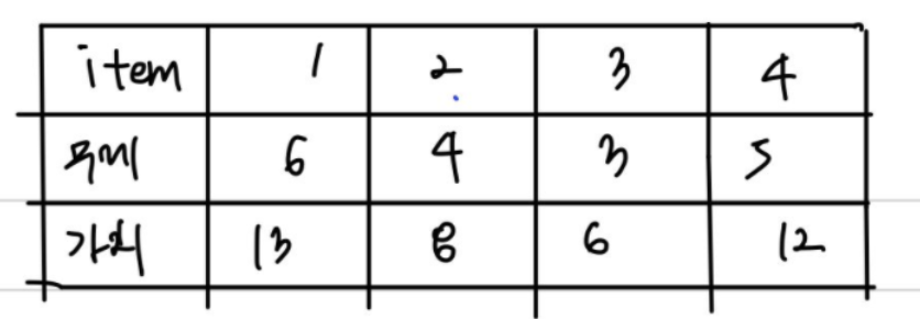 "아이템이 1까지만 있고, 배낭에 채울 수 있는 최대무게가 6일 때 최대가치는 13이다."
