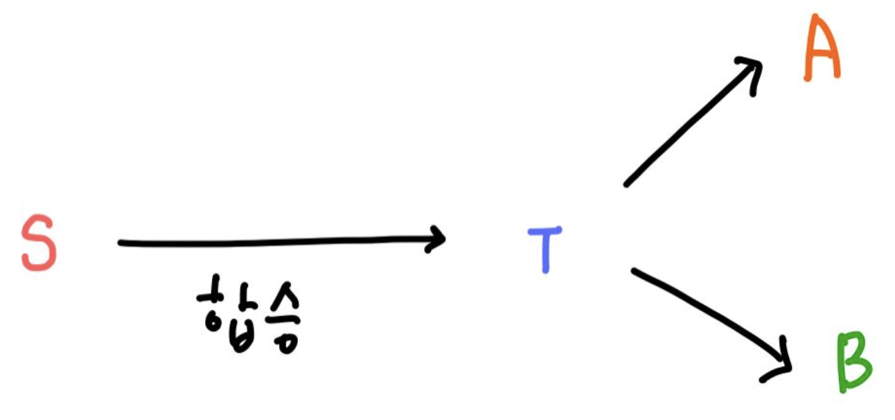 S -> T(합승 도착지) 까지 최단 경로를 구하고, 또, T -> A와 T -> B의 최단 경로를 구해서 3개를 더하면 최소 요금이 나온다.