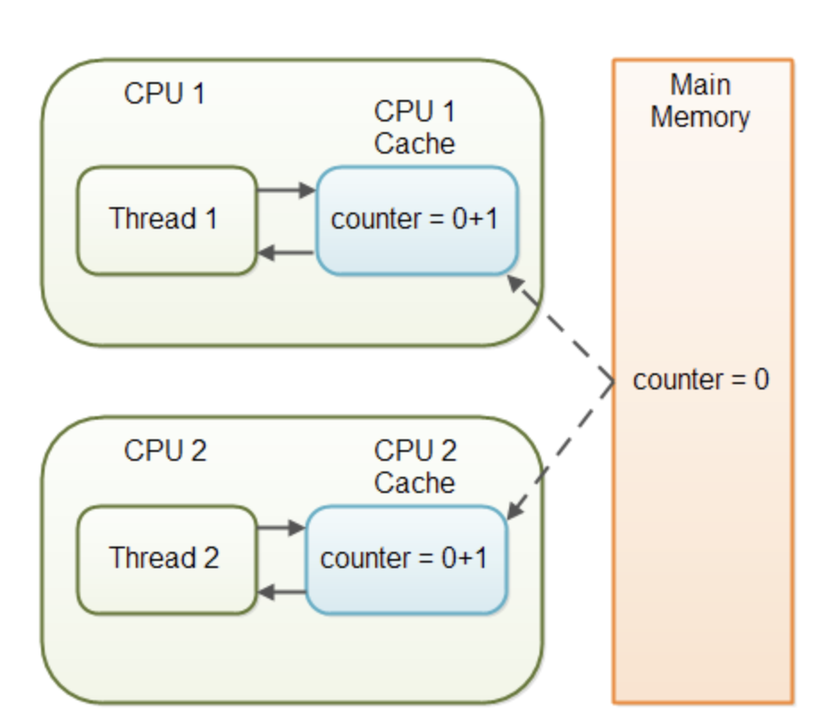 쓰레드1이 값이 0인 counter 변수를 CPU 캐시로부터 읽고, 이를 1로 증가시킨 후 메인 메모리에 다시 쓰기 전에 쓰레드2도 변수값이 여전히 0인 counter 변수를 메인 메모리로부터 CPU 캐시에 읽어들인다. Thread2도 마찬가지로 counter를 1로 증가시킨다.