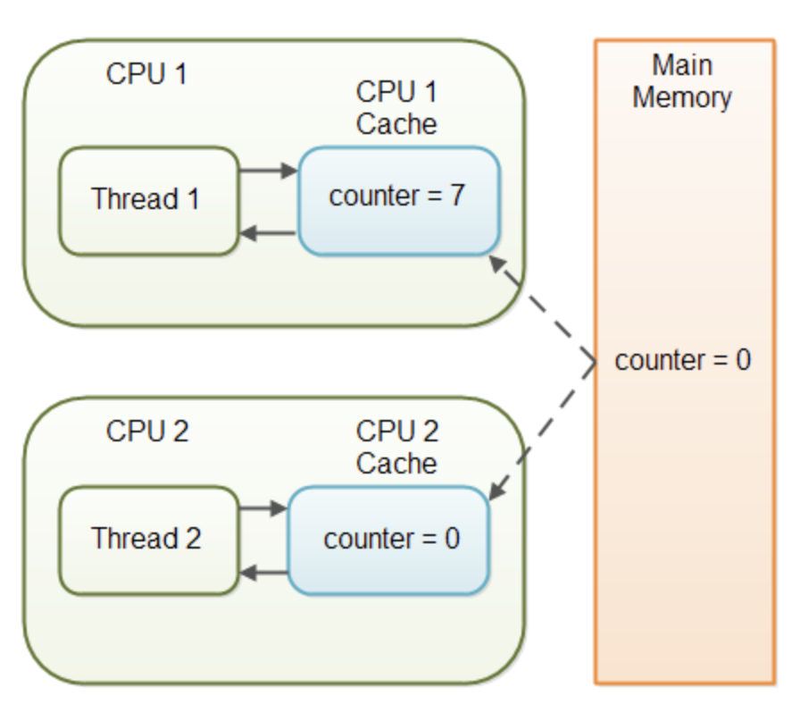 counter 변수가 volatile로 선언되지 않은 경우 counter 변수의 값이 CPU 캐시에서 메인 메모리로 다시 기록되는 시점에 대한 보장은 없다. 즉, CPU 캐시의 카운터 변수 값이 메인 메모리와 동일하지 않을 수 있다. 이 상황은 아래 그림과 같다.