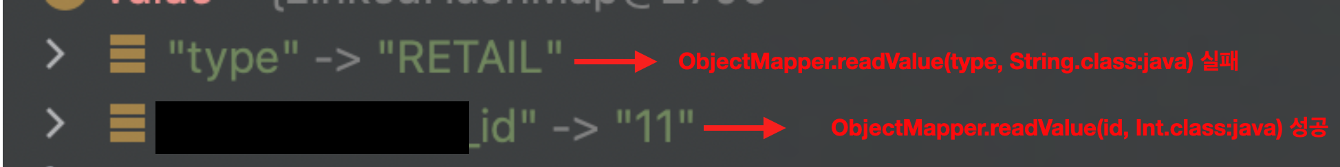 결론: String 타입인 객체는 ObjectMapper의 readValue를 사용할 수 없다. 대신 JSON String 형식으로 변환시켜주면 사용이 가능하다. 그리고 String 타입이더라도 "11" 처럼 실제 내용이 숫자인 경우는 예외로 readValue 사용이 가능하다.